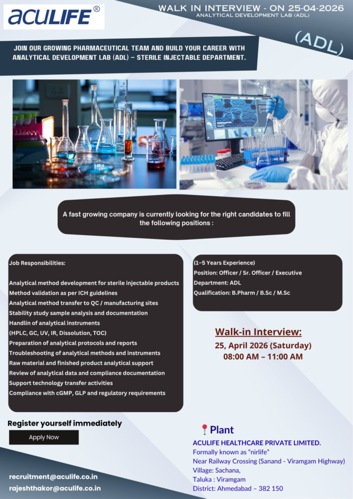 Candidates can directly attend the walk-in interview at the venue on the scheduled date. Interested candidates can also share resumes to recruitment@aculife.co.in and rajeshthakor@aculife.co.in. Freshers will receive training in sterile manufacturing, GMP documentation, and equipment handling, making this a strong entry point into pharma careers. Ensure you arrive early, dress professionally, and carry all documents for a smooth interview process. This opportunity provides excellent exposure to sterile injectable manufacturing and analytical development with long-term career growth.