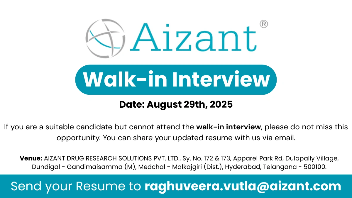 If you are looking for the latest pharma jobs in Hyderabad, this walk-in interview opportunity is a great chance to build your career in Quality Assurance and Quality Control. Aizant Drug Research Solutions Pvt. Ltd. is conducting interviews for multiple positions in QA and QC departments. Candidates with relevant experience in formulation and analytical techniques can explore excellent career growth opportunities with this organization.