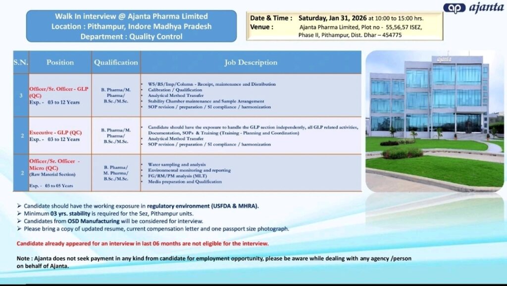 Ajanta Pharma Limited is conducting a large-scale walk-in interview at its Pithampur manufacturing facility, offering strong career opportunities for experienced professionals in Quality Assurance, Quality Control, and Warehouse functions. This hiring drive is aimed at strengthening regulated manufacturing operations and provides exposure to advanced quality systems, compliance-driven processes, and a stable pharmaceutical work environment. Candidates with relevant experience in OSD manufacturing and regulatory plants are encouraged to attend this on-site walk-in interview.