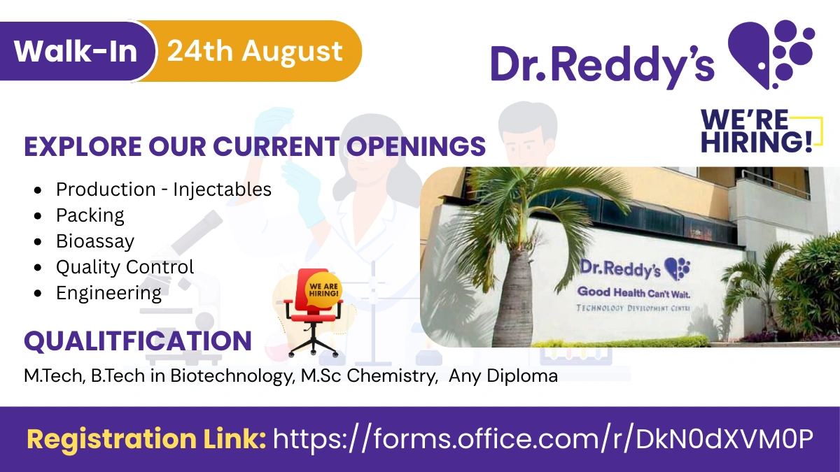 If you are looking for pharma jobs with a reputed company, this opportunity from Dr. Reddy’s Laboratories could be the right step for your career growth. With multiple openings across production, quality control, engineering, packing, and bioassay departments, this walk-in interview provides a strong platform for experienced candidates to showcase their skills and secure a stable role in the pharmaceutical industry.