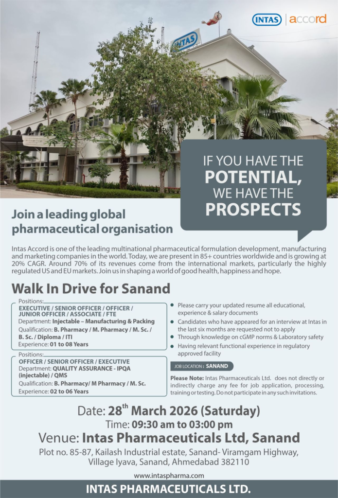 pharma jobs in Intas Pharmaceuticals Ltd offer excellent opportunities in formulation development, manufacturing, and global healthcare solutions. Intas is a leading multinational pharmaceutical company with operations in more than 85 countries and strong presence in regulated markets like the US and EU. The company specializes in formulation development, manufacturing, and marketing of pharmaceutical products with a strong focus on quality, compliance, and innovation. Known for its advanced facilities and employee-friendly work culture, Intas provides a platform for professionals to grow in a highly regulated and technologically advanced environment.