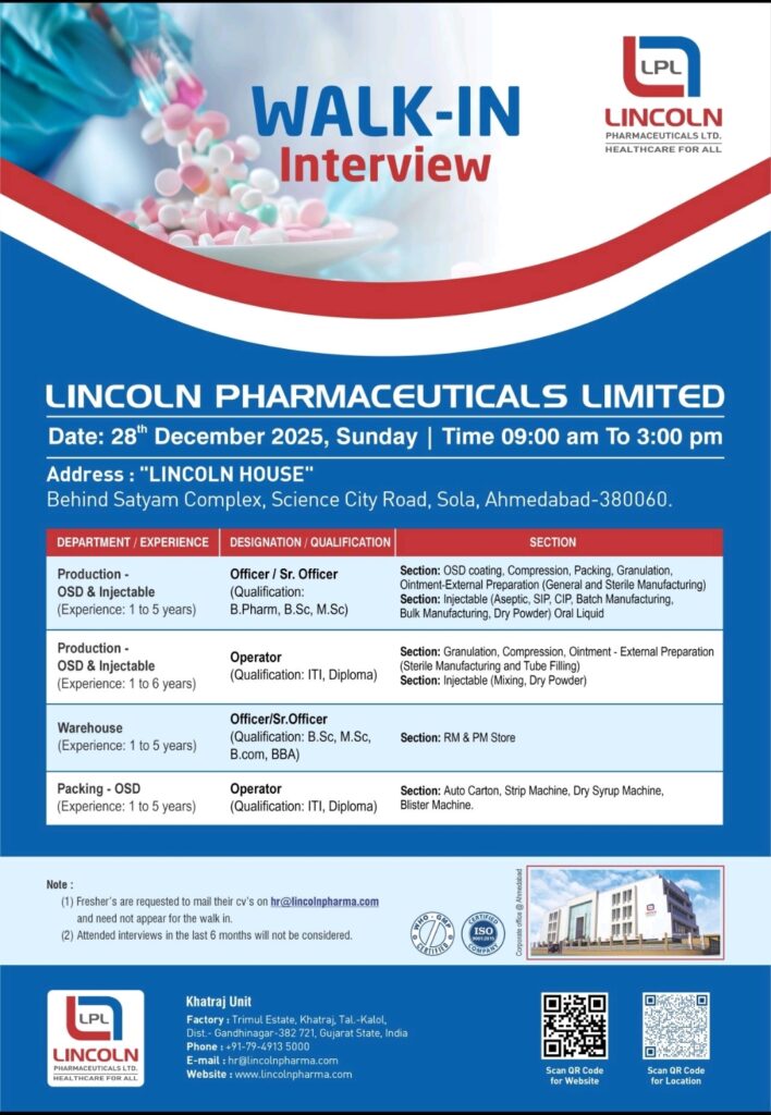 Lincoln Pharmaceuticals Limited Pharma jobs for Production, QA, QC, ADL, F&D, Warehouse, Packing, BPharm, BSc, MSc, MPharm, ITI, Diploma bring a strong career opportunity for pharma professionals through a scheduled walk-in interview. This walk-in drive is ideal for candidates looking to work with a reputed pharmaceutical company known for quality manufacturing, compliance-driven operations, and long-term career growth in regulated markets.