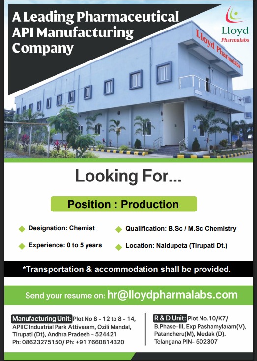 Pharma jobs at Lloyd Pharmalabs are part of a leading pharmaceutical API manufacturing organization known for its quality-driven operations and strong compliance culture. The company focuses on active pharmaceutical ingredients manufacturing and research, with well-established manufacturing and R&D units located in Pashamylaram (Telangana) and Naidupeta, Tirupati district (Andhra Pradesh). Lloyd Pharmalabs follows regulated market standards, emphasizes safety, continuous improvement, and provides a supportive work environment with employee-friendly facilities.
