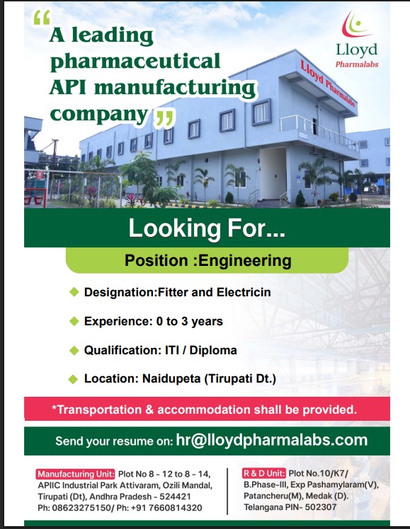 Lloyd Pharmalabs has announced new pharma job openings for multiple departments, offering a strong opportunity for candidates looking to build a stable career in a reputed API manufacturing company. These openings cover R&D, AR&D, Production, and Engineering roles across Telangana and Andhra Pradesh locations, with facilities support like transportation, accommodation, and canteen benefits, making it an attractive option for both experienced professionals and early-career candidates.