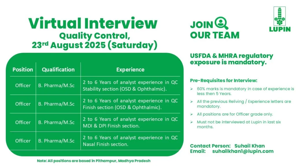If you are looking for rewarding pharma jobs with excellent growth opportunities, Lupin Limited has announced virtual interviews for multiple positions in Production and Quality Control departments. This is a golden opportunity for qualified candidates to work with a leading pharmaceutical company that values innovation, compliance, and career development. The walk-in interview is scheduled for 23rd August 2025, and interested applicants are encouraged to prepare well and apply as per the details shared.