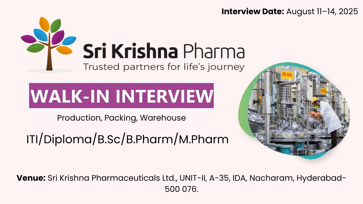 Candidates are encouraged to arrive on time, dress professionally, and carry all required documents. This walk-in is an excellent platform for experienced professionals to showcase their expertise and secure a position in a reputed pharmaceutical company. Joining Sri Krishna Pharma not only offers job stability but also provides exposure to advanced manufacturing processes and growth-oriented work culture. Interested candidates should make the most of this opportunity and attend the interview as per the schedule.