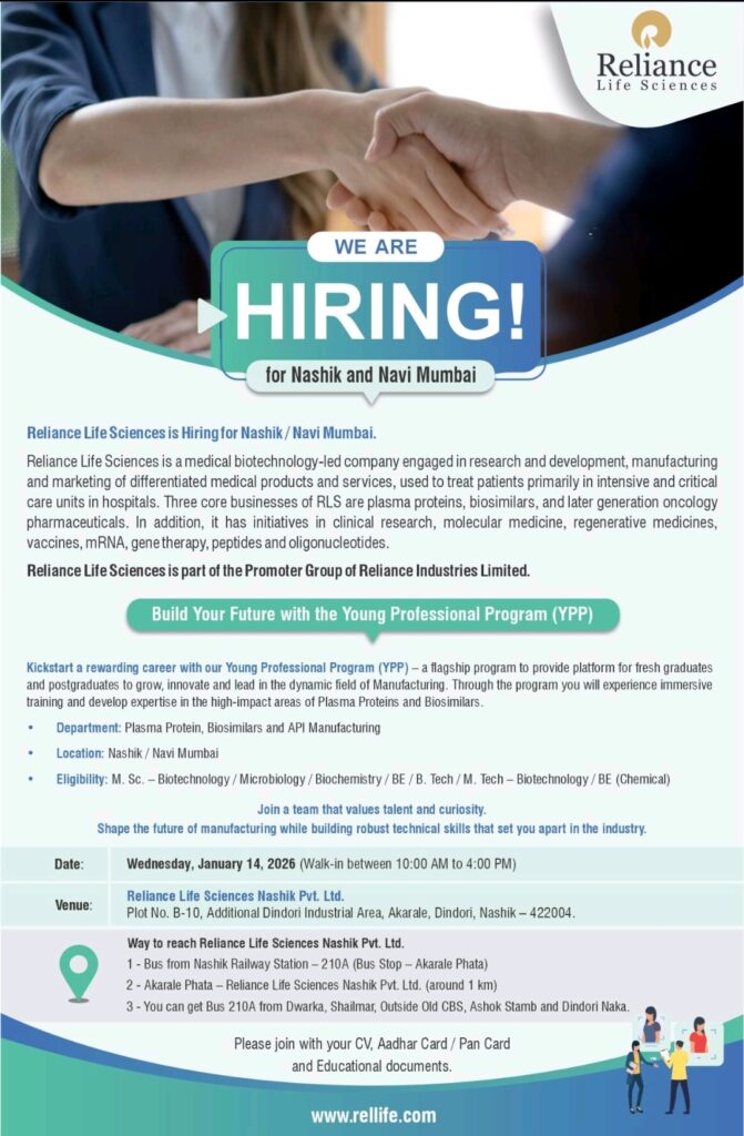 Reliance Life Sciences Pharma jobs for Manufacturing, Production, BSc BE BTech MSc – 14 January 2026