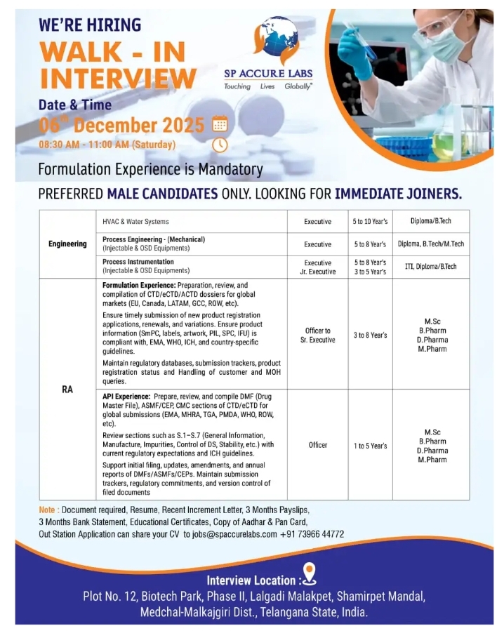 If you’re searching for strong career openings in the pharmaceutical sector, this post will help you explore SP Accure Labs Pharma jobs in Hyderabad. This walk-in drive offers a good opportunity for experienced professionals in multiple operational and technical areas.