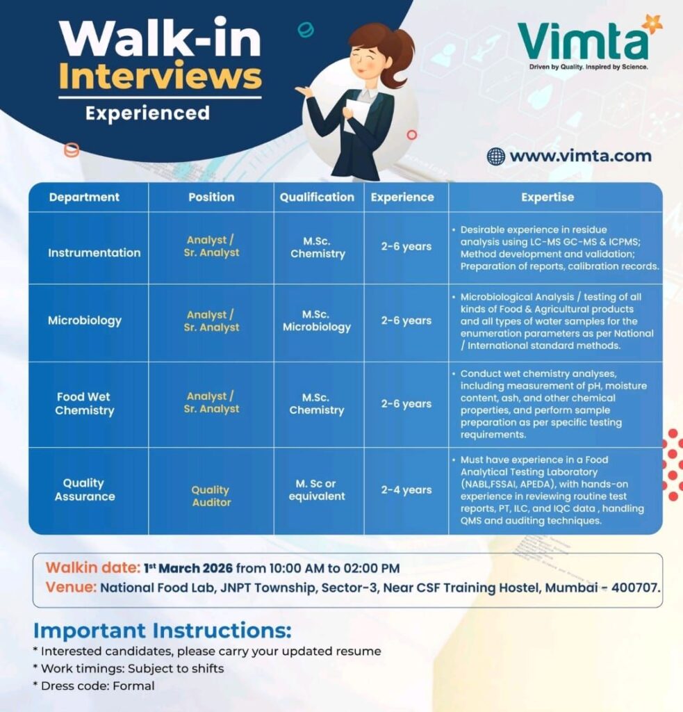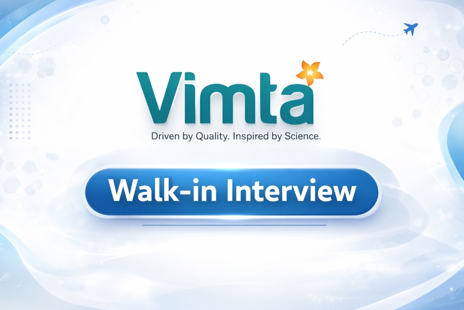Vimta Pharma jobs walk-in interview 2026 brings excellent opportunities for Life Sciences freshers and experienced professionals in analytical, microbiology, food chemistry, and quality assurance domains. This hiring drive is a great chance for candidates who want to build their careers in a reputed testing and analytical organization with exposure to advanced laboratory techniques and regulated environments.