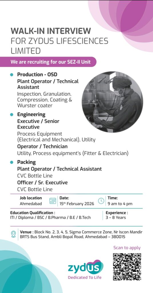 Interested candidates can directly attend the walk-in interview at the respective venue on the given date and time. Candidates must ensure they meet the experience and qualification criteria before appearing. Those with exposure to regulated and USFDA approved units will have an added advantage. Arrive on time, dress professionally, and carry all required documents to ensure a smooth interview process. Zydus Lifesciences pharma jobs offer strong career growth, exposure to advanced manufacturing systems, and an opportunity to work in globally compliant facilities.